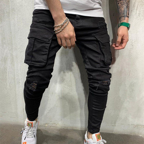 Multi-pocket Elasticity Stretch Pants Skinny Men Jeans with Ripped Hole