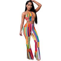 Amazon hot selling sexy 2 piece set sets of pants and blouse for lady crop top Rainbow Stripe Print Backless Wide Leg with Belt