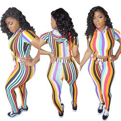 アマゾンの売れ筋セクシーな2ピースセットのパンツとブラウスのレディースクロップトップレインボーストライププリントバックレスワイドレッグベルト付き
